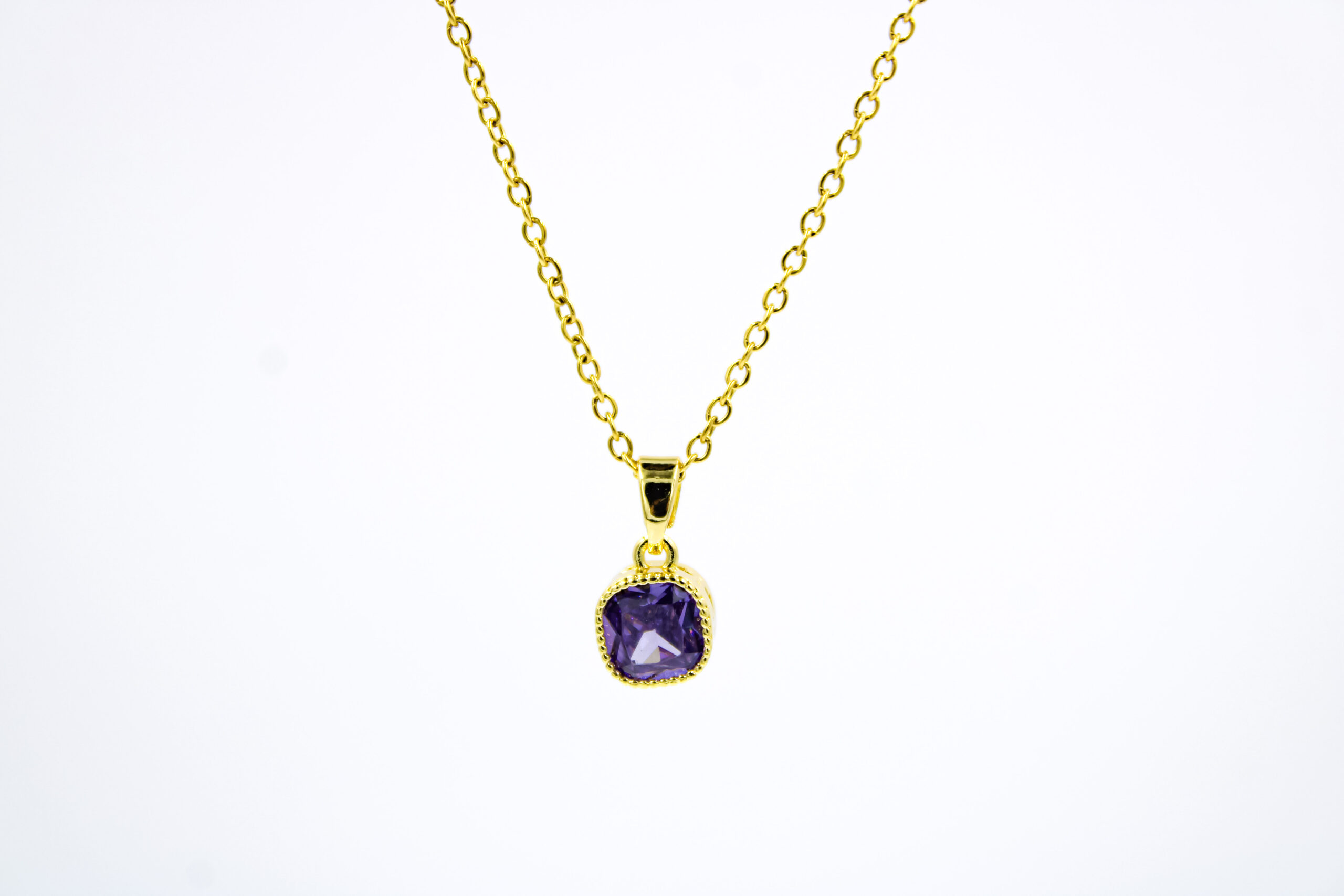 Elevate your everyday elegance with this stunning gold-plated necklace featuring a delicate chain and a striking purple gemstone pendant. The square-cut stone, set in a finely detailed bezel, adds a regal charm while maintaining a minimal and versatile design. Perfect for layering or wearing solo, this necklace transitions seamlessly from day to night, complementing both casual and festive looks. A timeless blend of sophistication and modern style, this piece is a must-have jewellery essential that adds a graceful touch to any outfit.