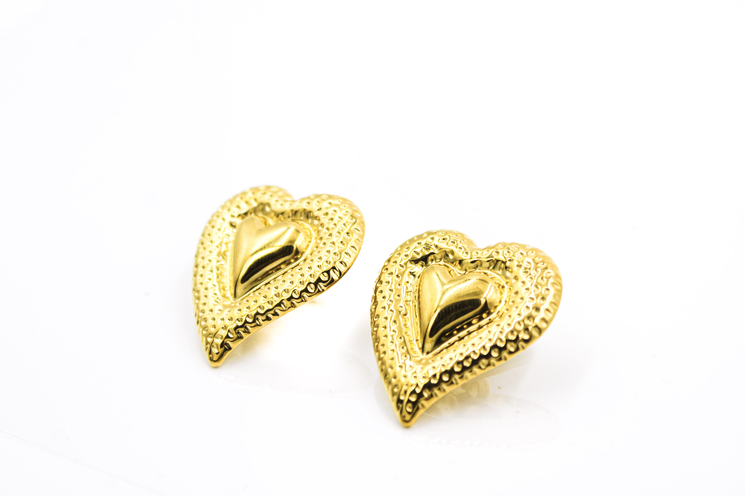Bold, sculptural, and unapologetically tender- these heart-shaped studs redefine statement minimalism. The textured gold form frames a high-shine heart core, radiating warmth and presence. Whether paired with crisp shirts or sleek dresses, they bring a sense of intimacy and strength to your look. Eear them solo or with their matching necklace for a striking coordinated finish.
